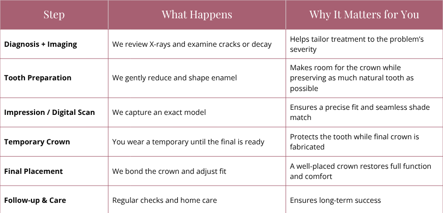 She chose the crown route. Over two visits, the tooth was prepared, a digital impression made, and the final custom crown placed. Within days, the pain subsided and Lisa told us, “It’s like the tooth never knew anything was wrong.”