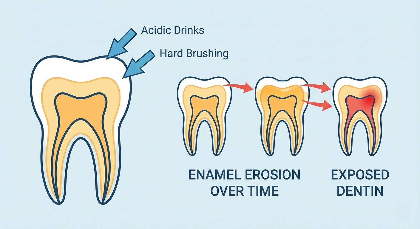 Aggressive brushing with a hard bristle brush, whitening products used too often, and acidic foods like citrus, soda, and sports drinks can slowly thin enamel over time. It is like sanding a tabletop just a little bit every day. You do not notice the change until suddenly the surface feels raw.
